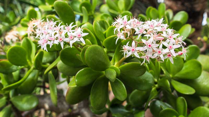 The Jade Plant is a symbol of good luck and wealth. While it’s often grown for its blue-green foliage with burgundy edges, mature plants also produce delicate pink or white star-shaped flowers in late winter or spring.