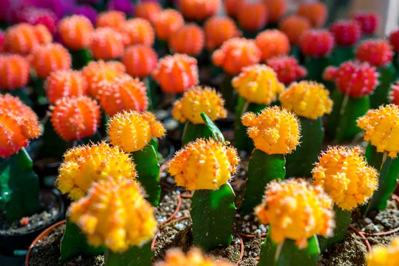 While its vivid coloration is its most famous feature, Moon Cactus may also produce small flowers in spring with proper care.