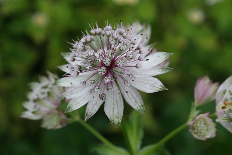 Masterwort features intricate, pincushion-like white flowers tinged with soft pinks or greens, surrounded by papery bracts. Its unique appearance adds texture and sophistication to shaded beds.