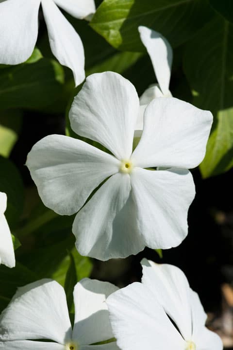 Also called periwinkle or creeping myrtle, vinca produces soft white or bluish-white flowers against glossy, evergreen foliage.