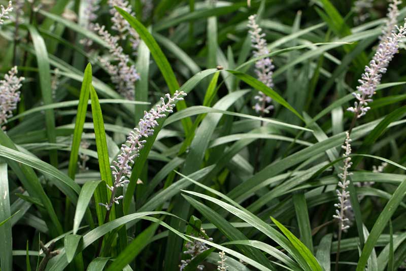 Also called lilyturf or monkey grass, this perennial produces grass-like clumps of evergreen foliage and spikes of small, tubular flowers.