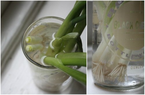 - Take store-bought scallions and place the white root ends in a cup of water.