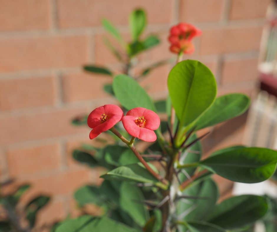 While it prefers sun for continuous blooming, crown of thorns can survive in low-light conditions, although it may not flower as frequently. It’s a tough plant with bright flowers and thorny stems.