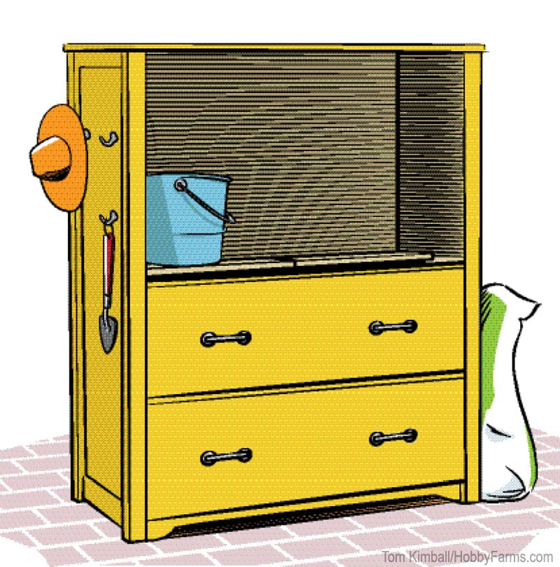 Repurpose an old wooden dresser by removing a few drawers and converting them into storage space for pots, soil, and tools. Add a coat of weatherproof paint for durability!