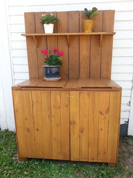 Got leftover wooden fence panels? Turn them into a rustic, weather-resistant potting bench with built-in shelves for maximum storage.