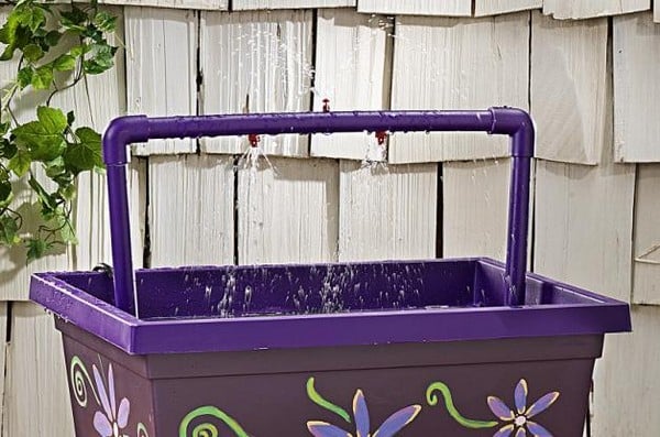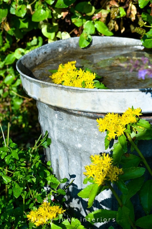 - Take an old metal or wooden bucket and place it on an inverted planter or stump.
