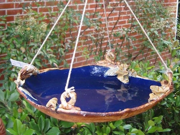 - Use a large cobalt blue ceramic dish or bowl as the main bird bath.