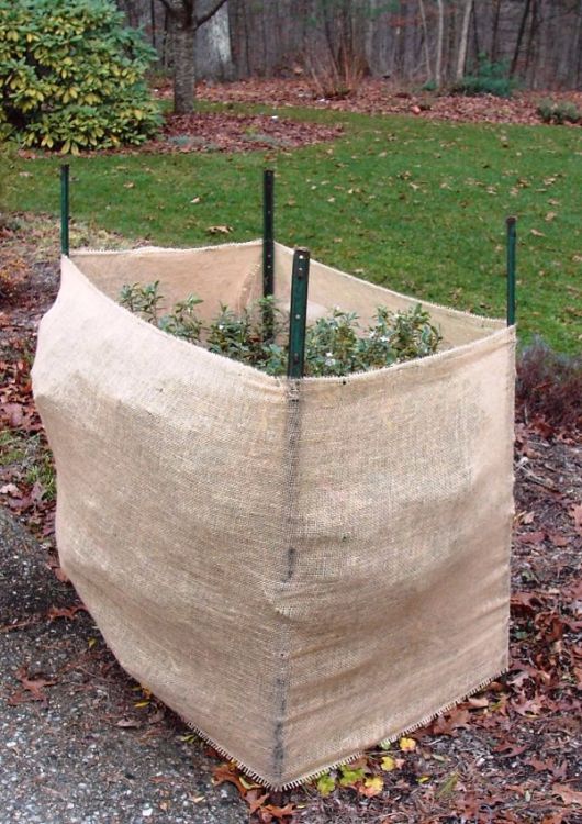 Wrap burlap around shrubs, roses, and other cold-sensitive plants to create a protective barrier against frost, wind, and snow.