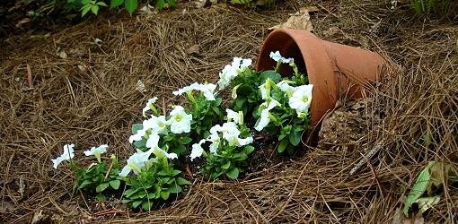 A classic terra cotta pot tipped on its side with vibrant petunias flowing out creates a bright and cheerful garden focal point.