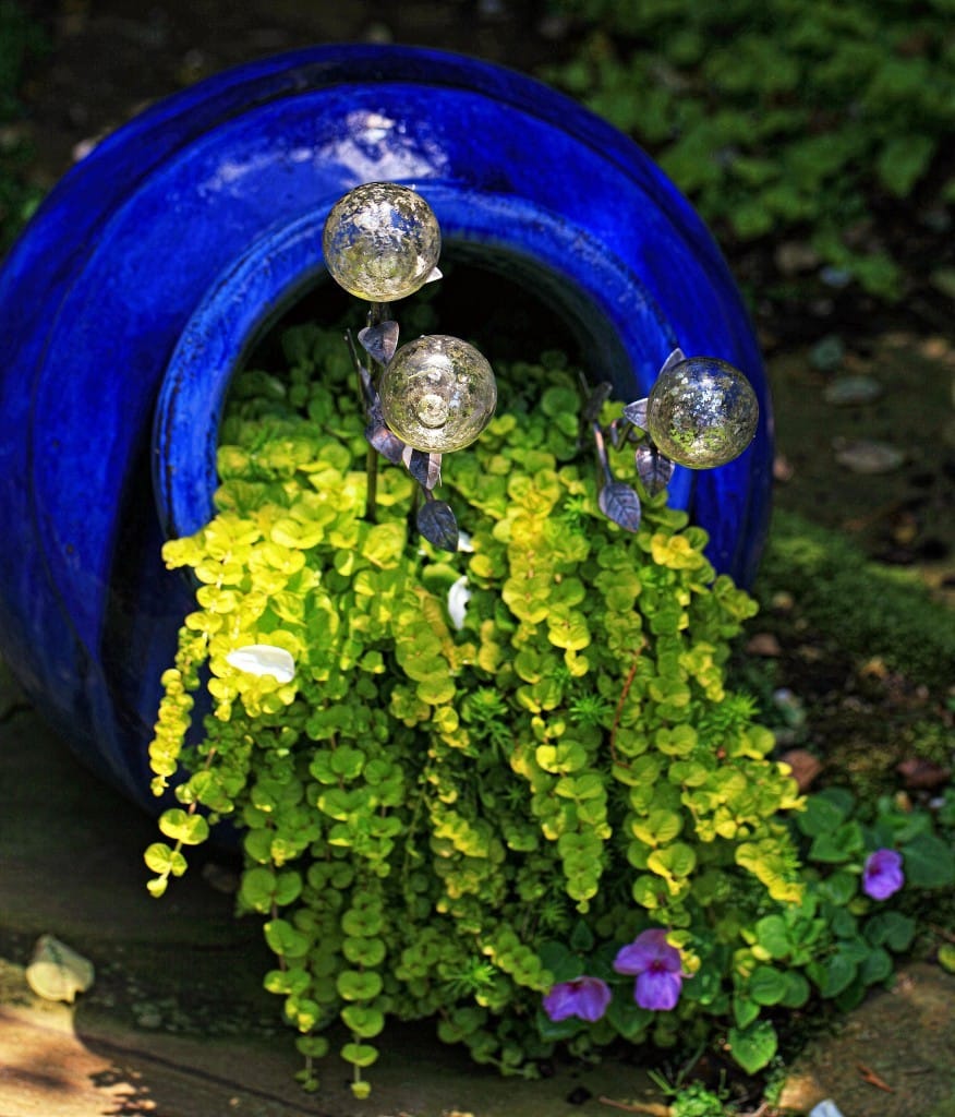 A combination of vining plants, low-growing flowers, or even decorative elements like glass baubles can be used to enhance the effect.
