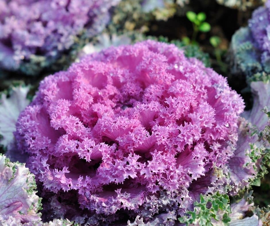 You can also grow ornamental cabbages, which have ruffled purple and green leaves. They are edible, though slightly bitter, and are often grown mainly for their decorative value in flower beds.