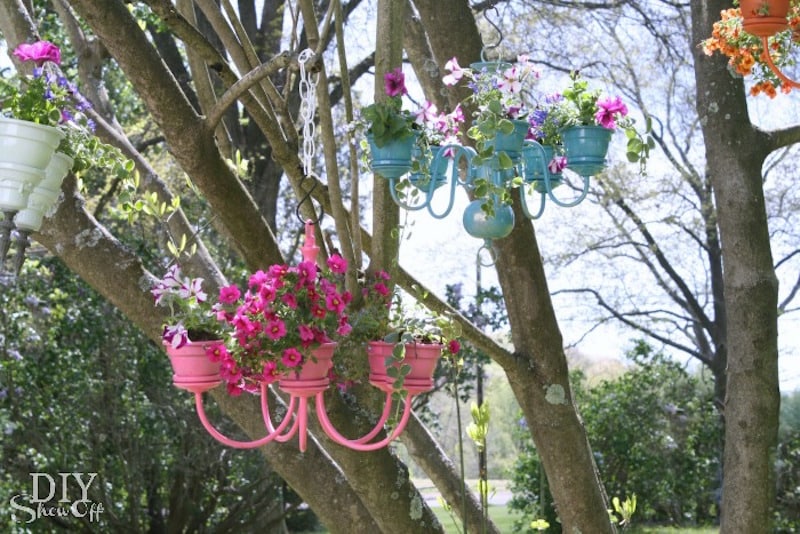 Repurpose an old chandelier frame and attach small terra cotta pots to create a stunning hanging garden feature. Plant trailing vines, succulents, or colorful flowers for a breathtaking effect.