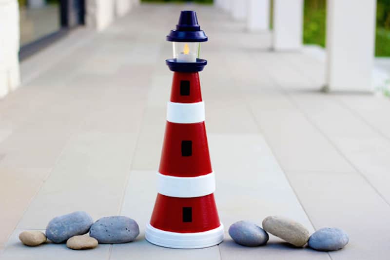 Stack terra cotta pots in ascending sizes, paint them in classic lighthouse colors, and add a solar-powered light on top to create a charming DIY lighthouse.