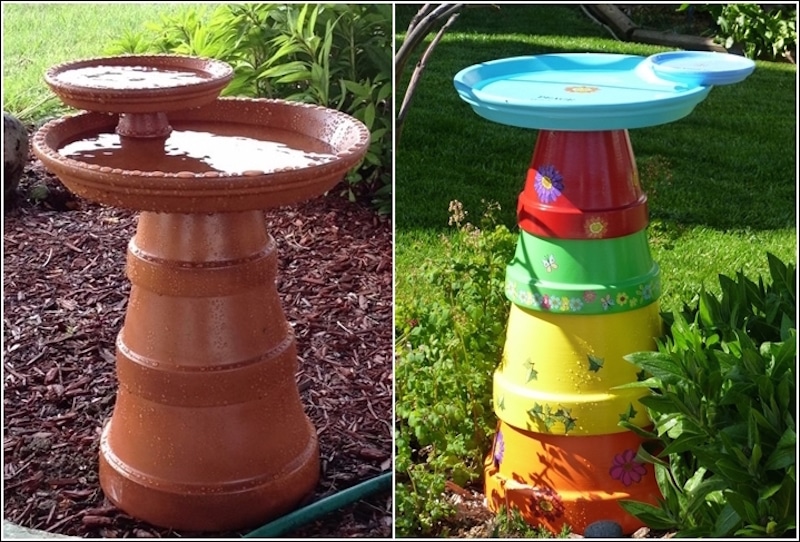 Stack two or three terra cotta pots upside down, place a large saucer on top, and seal it with waterproof paint to create a beautiful bird bath.