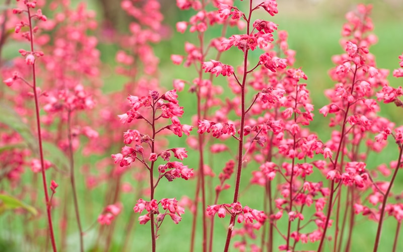 Heuchera (Coral Bells) is a shade-loving, drought-resistant plant with colorful foliage ranging from deep purple to bright green.