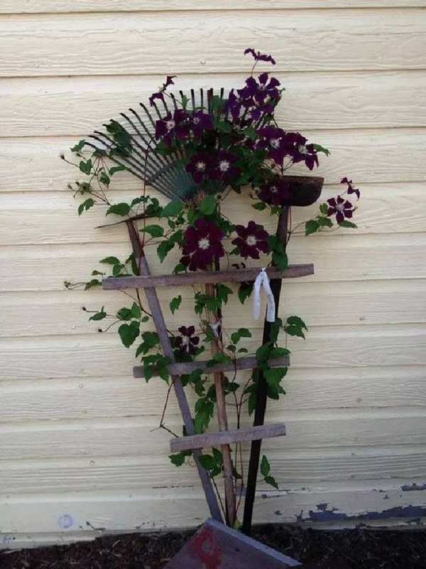 Old garden tools like rakes, hoes, and pitchforks can be artfully arranged and fastened together to form a functional trellis with a touch of rural nostalgia.