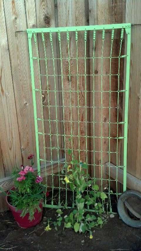 An old baby crib can become multiple trellises in one. The metal mattress spring can be mounted against a wall or staked into the ground as a vertical grid for climbing plants.