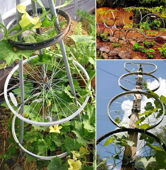 Recycled bicycle wheels can be stacked or connected with wire or metal rods to create a whimsical trellis design.