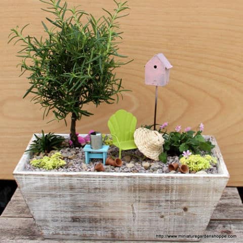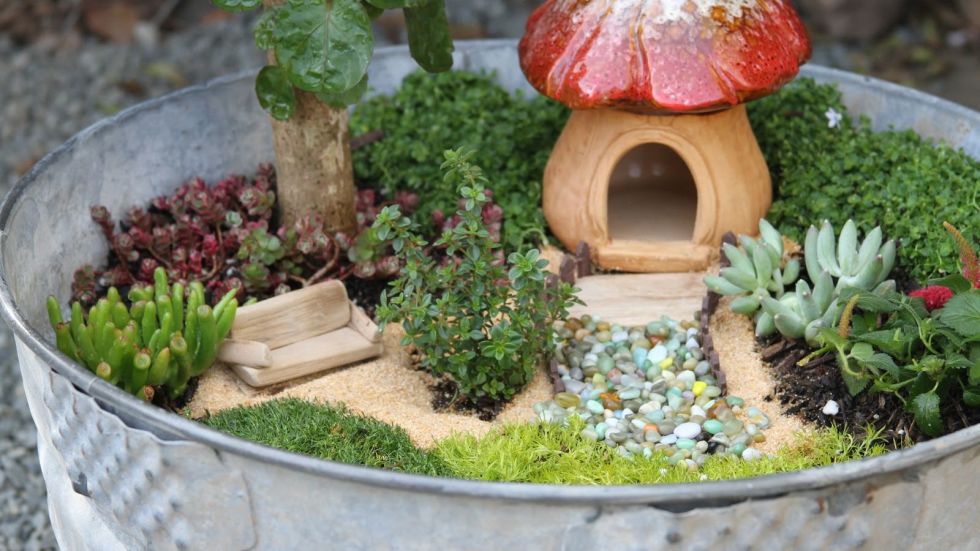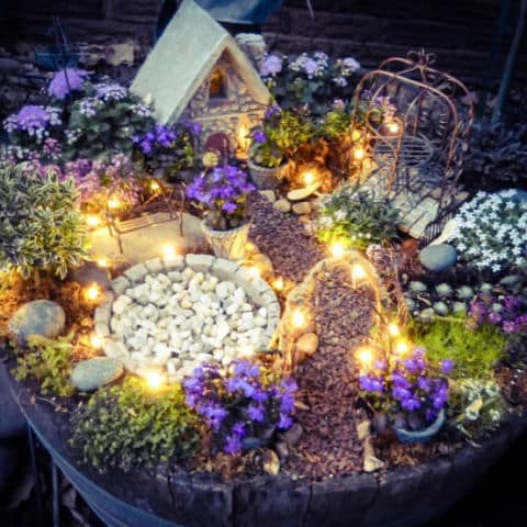 A fairy garden planter is a miniature world of magic made from repurposed containers.