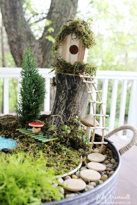Turn an old metal wash tub into a whimsical miniature house by adding a small door, windows, and moss-covered pathways.