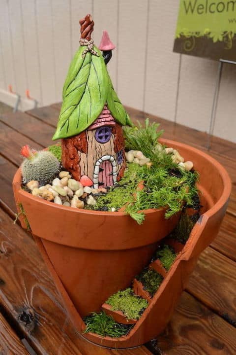 A cracked or broken flower pot doesn’t have to go to waste! Turn it into a multi-level fairy garden.