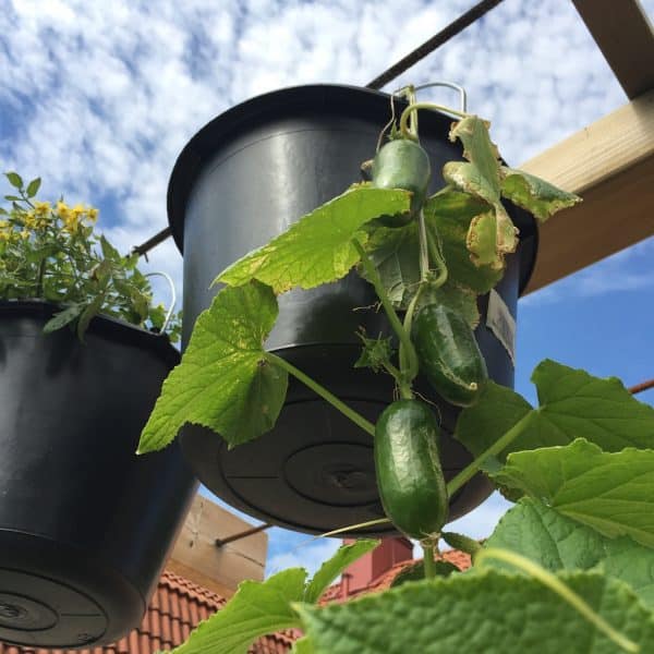 Cucumbers can be grown in hanging baskets with a sturdy support structure to accommodate their weight.
