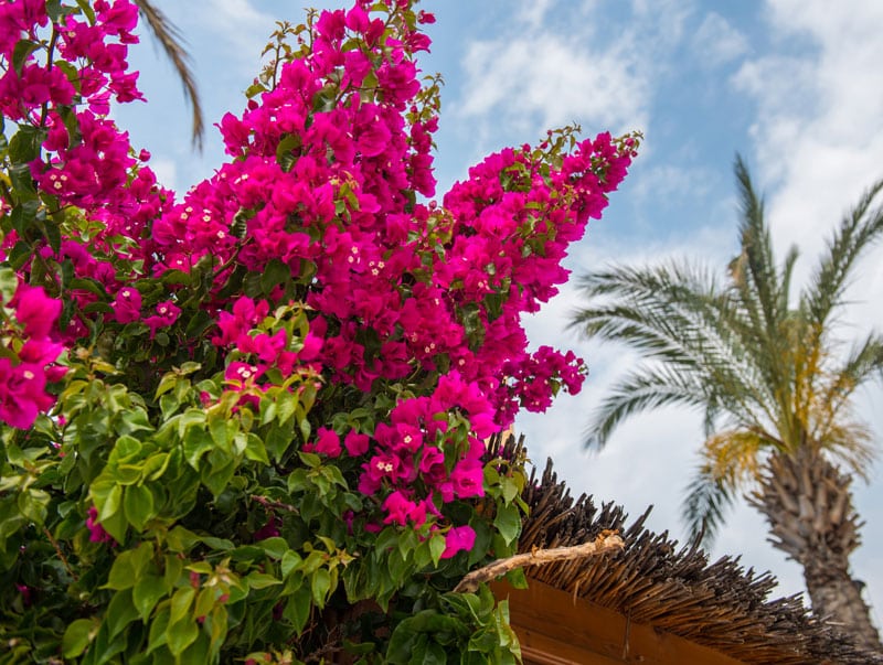A bold, tropical favorite, bougainvillea boasts vibrant pink, purple, orange, or white bracts. It’s an evergreen in warmer climates.
