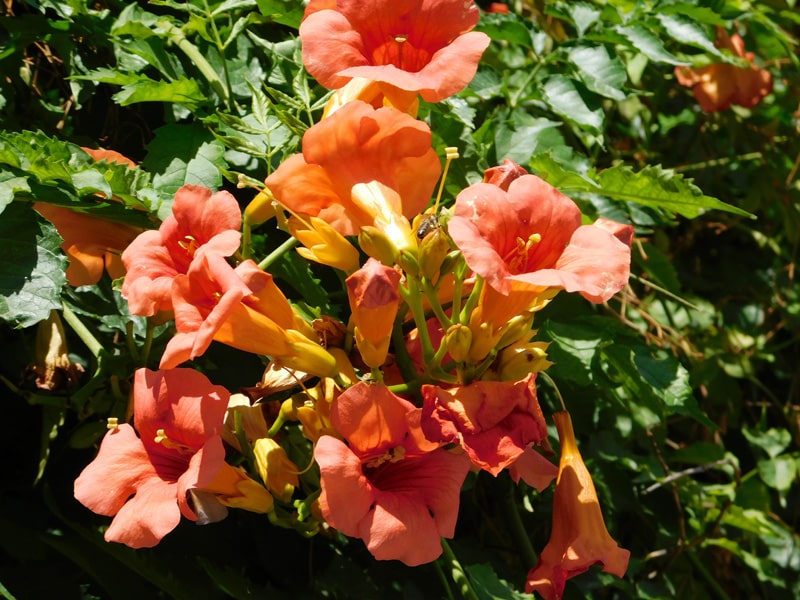 Trumpet vine is a show-stopping climber with large, flared blooms in shades of orange, red, or yellow. It’s perfect for attracting hummingbirds.