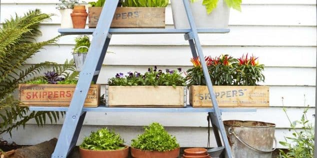 Use a ladder as a vertical garden for growing herbs, tomatoes, peppers, or leafy greens in small spaces.