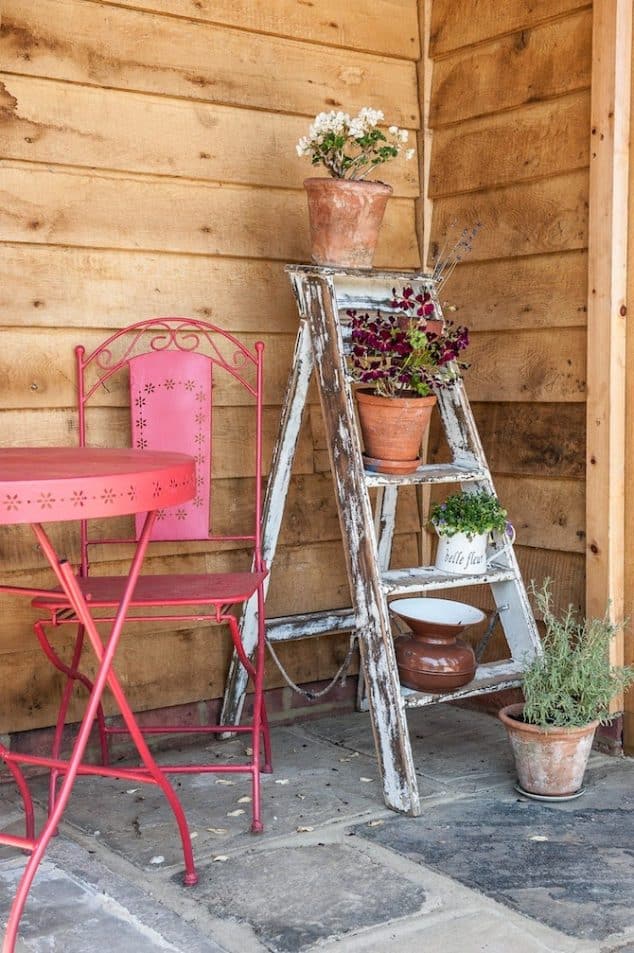 Turn an old wooden ladder into a gorgeous plant stand by placing potted flowers or cascading vines on each step.
