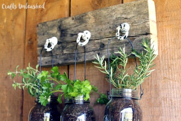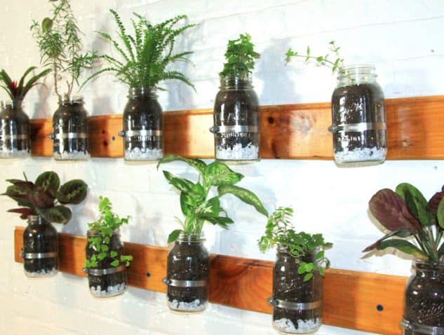 Install a row of glass jars filled with herbs on an outdoor or indoor wall to maximize growing space.