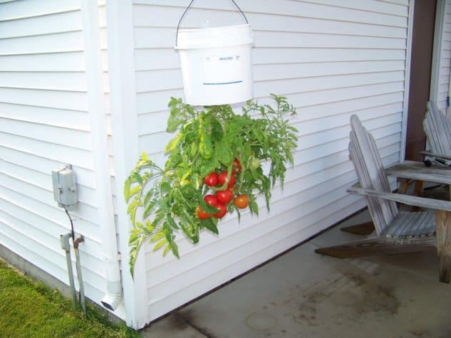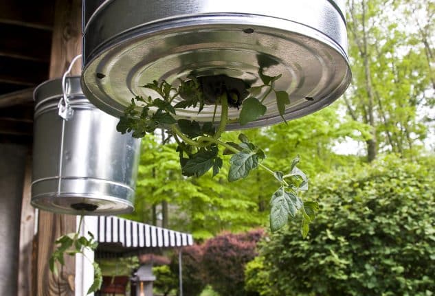 Upside-down tomato planters save space while keeping plants off the ground and safe from pests.