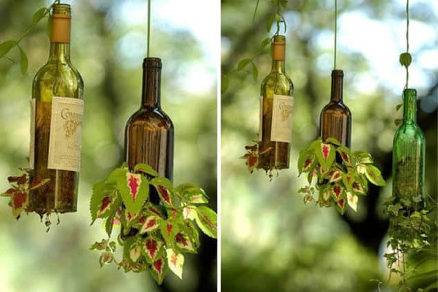 Repurpose old wine bottles by cutting them in half and turning them into hanging flower planters.