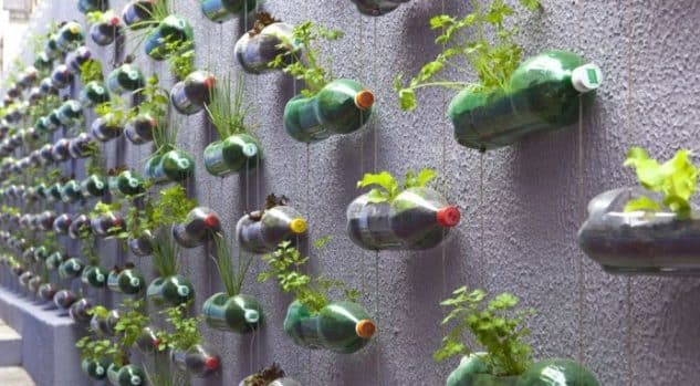 Give plastic or glass bottles a second life by turning them into hanging herb planters.