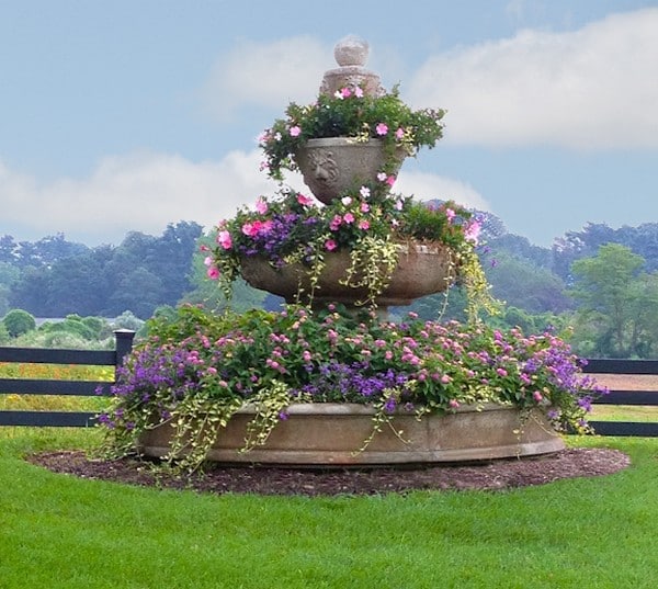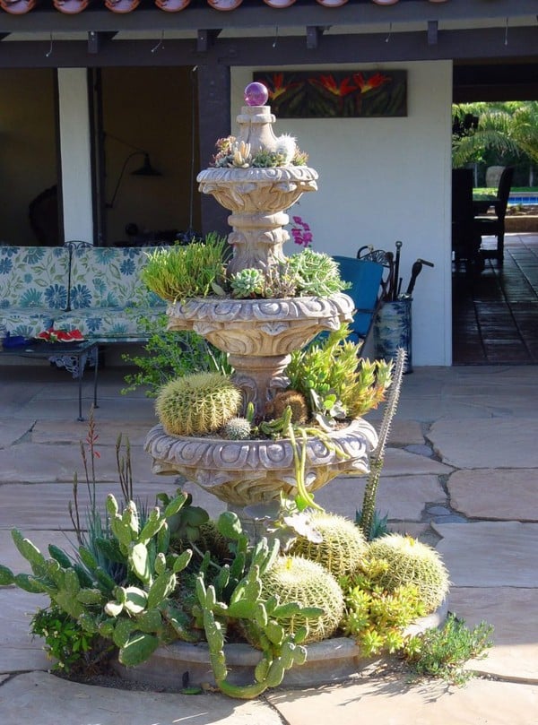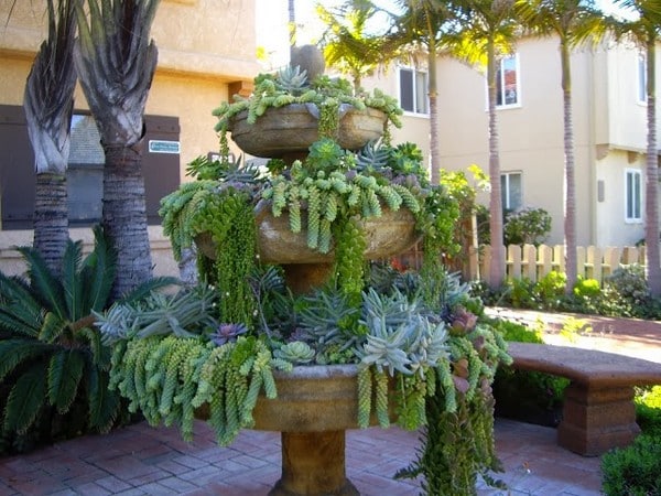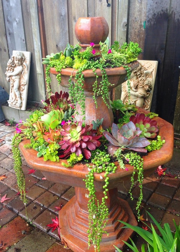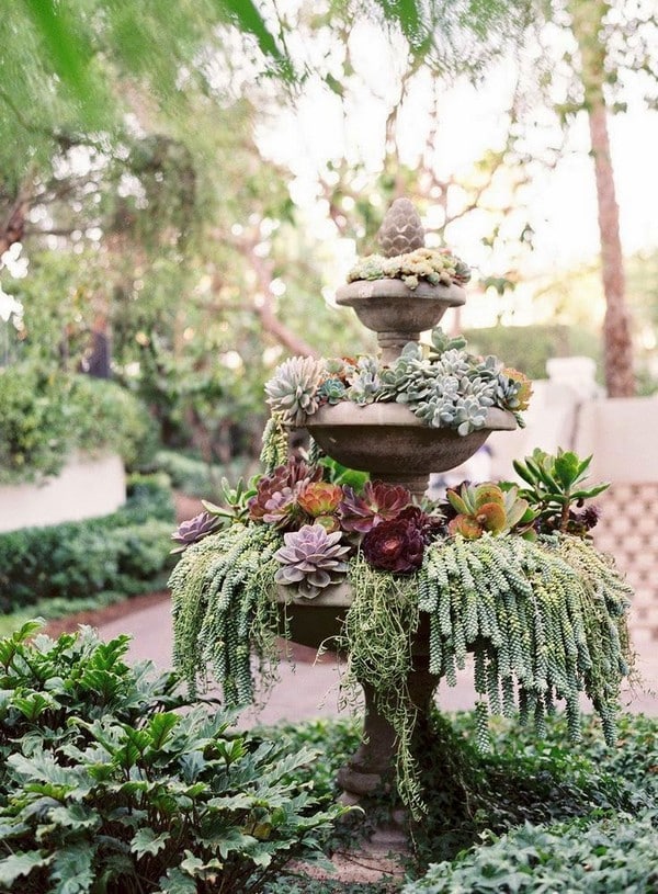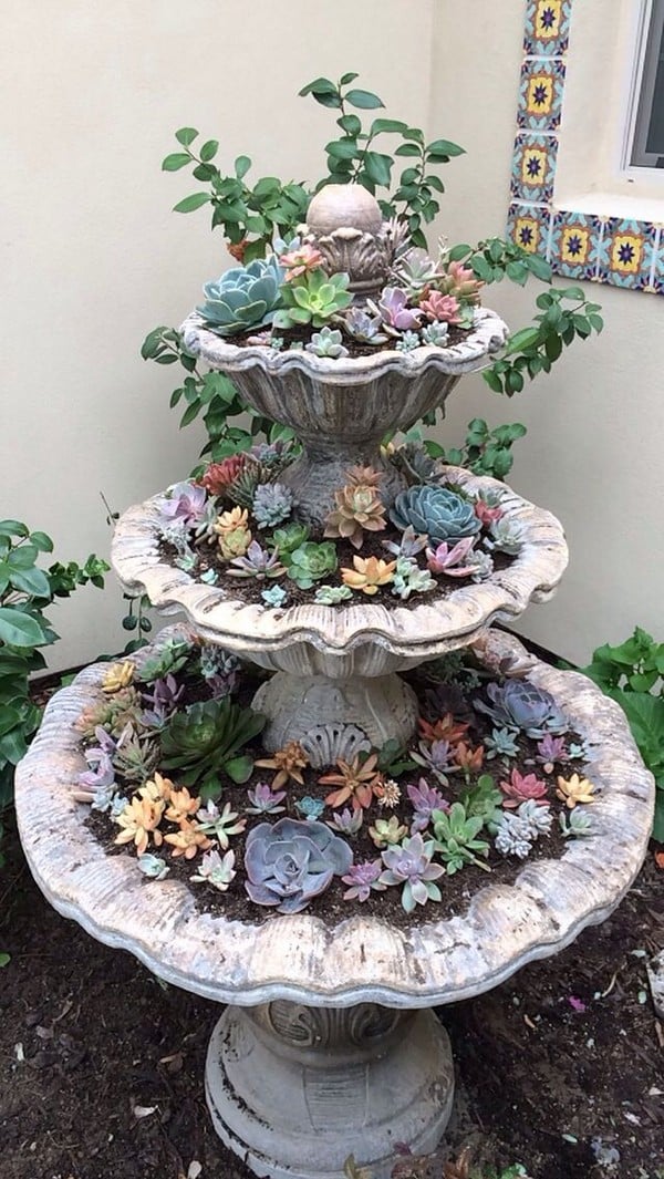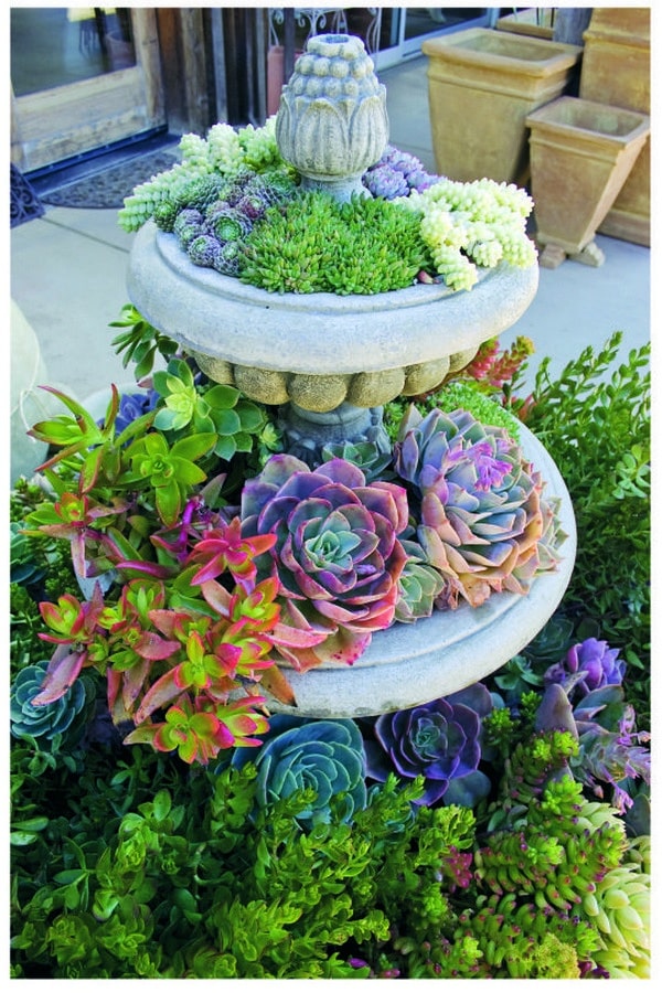 You can layer different levels of the fountain with a variety of succulents to add dimension and interest.