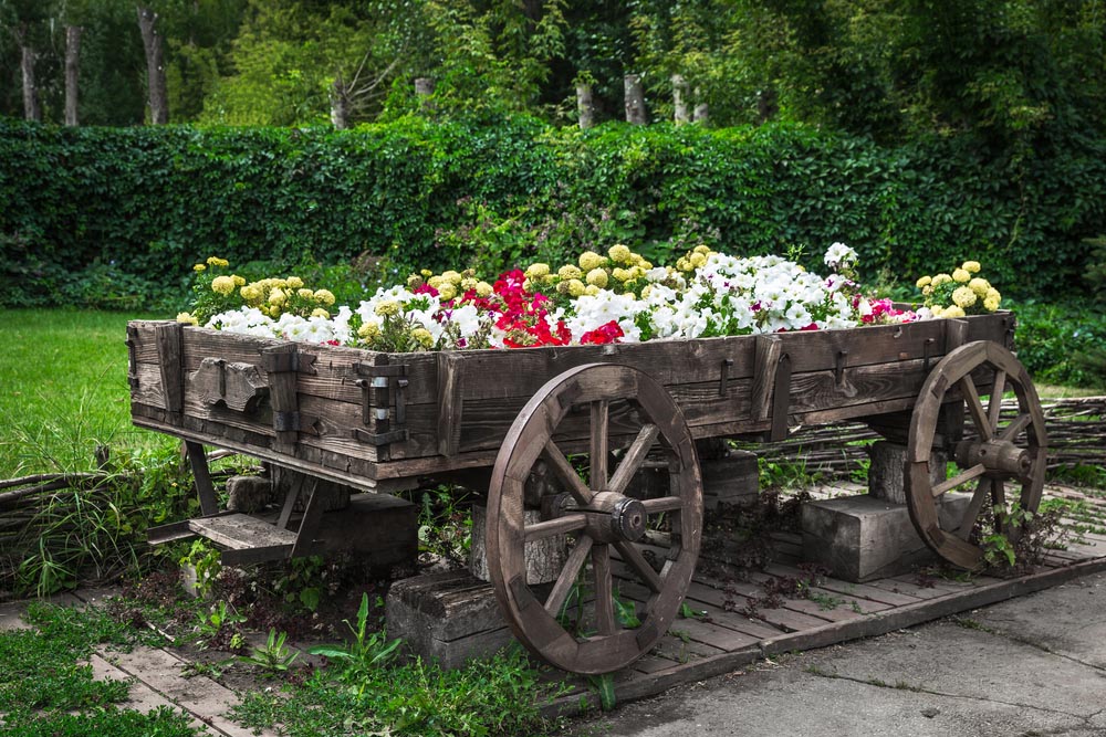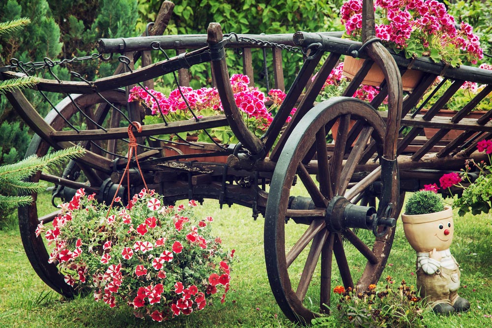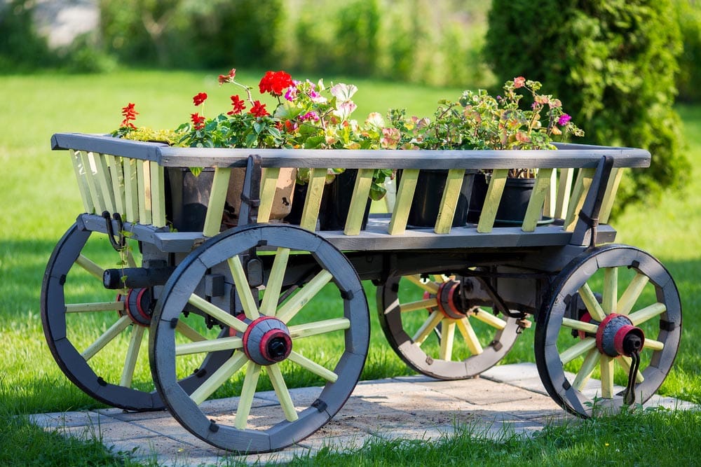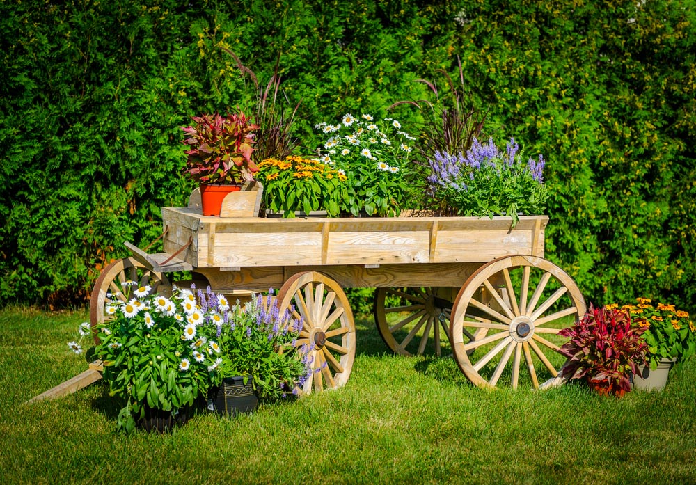If you have a small yard, consider a two-wheeled wagon with a vibrant painted planter.