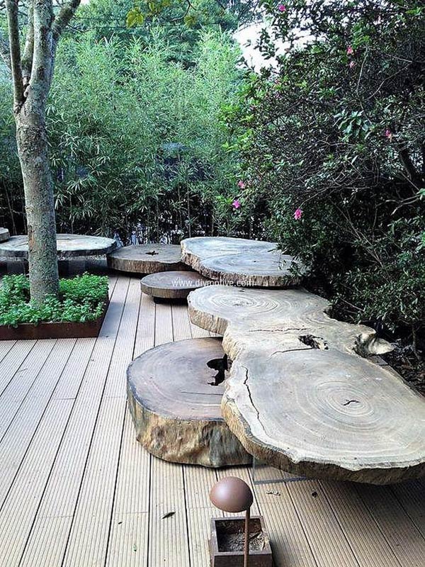 Thick slices of large tree trunks make sturdy, rustic benches that fit perfectly into any garden setting.