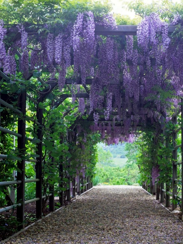 If you want dramatic visual appeal, nothing beats wisteria’s cascading purple, blue, or white blooms. Its twisted, woody vines become more picturesque with age, giving your pergola an “old-world” charm.