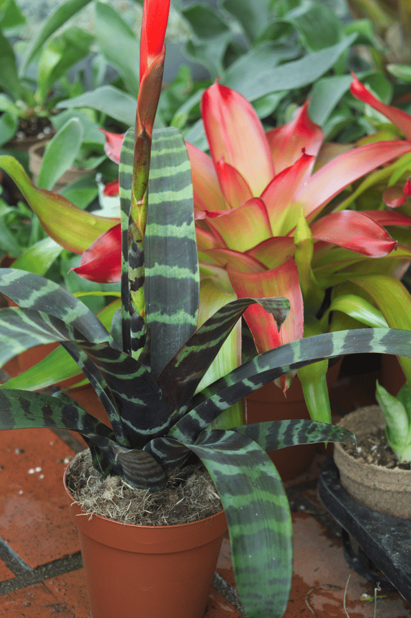 This bromeliad earns its name from the bold, red sword-like flower it produces. Its striped leaves are also highly ornamental.