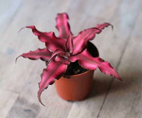 This unique bromeliad has star-shaped foliage with dark burgundy tones and irregular white bands.