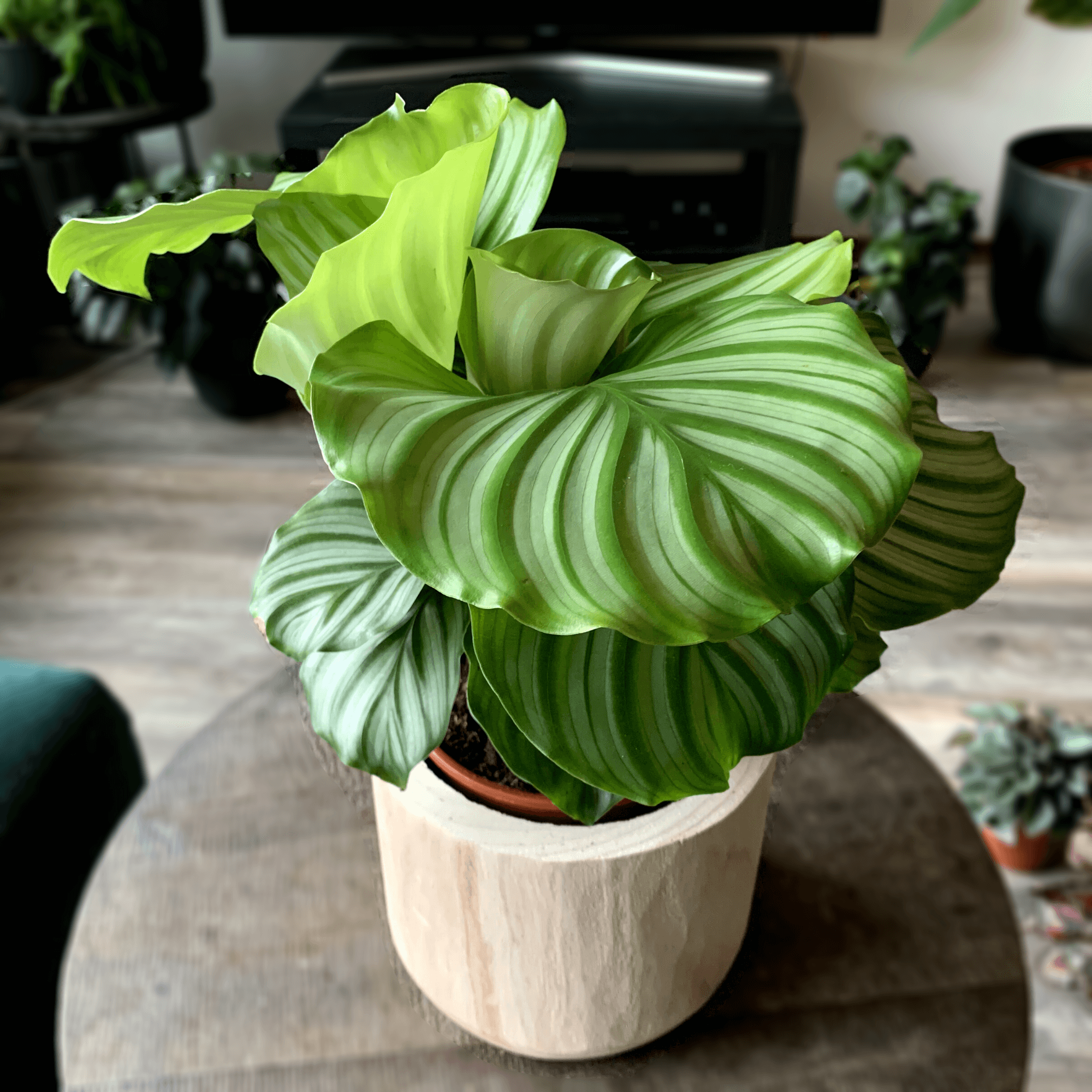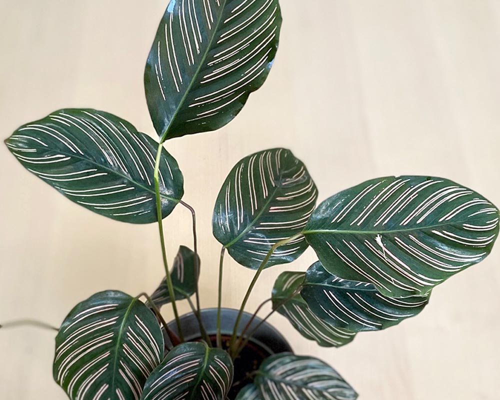 The Zebra Calathea is a showstopper with its velvety mid-green leaves featuring darker green zebra-like stripes. It thrives in indirect light and high humidity.