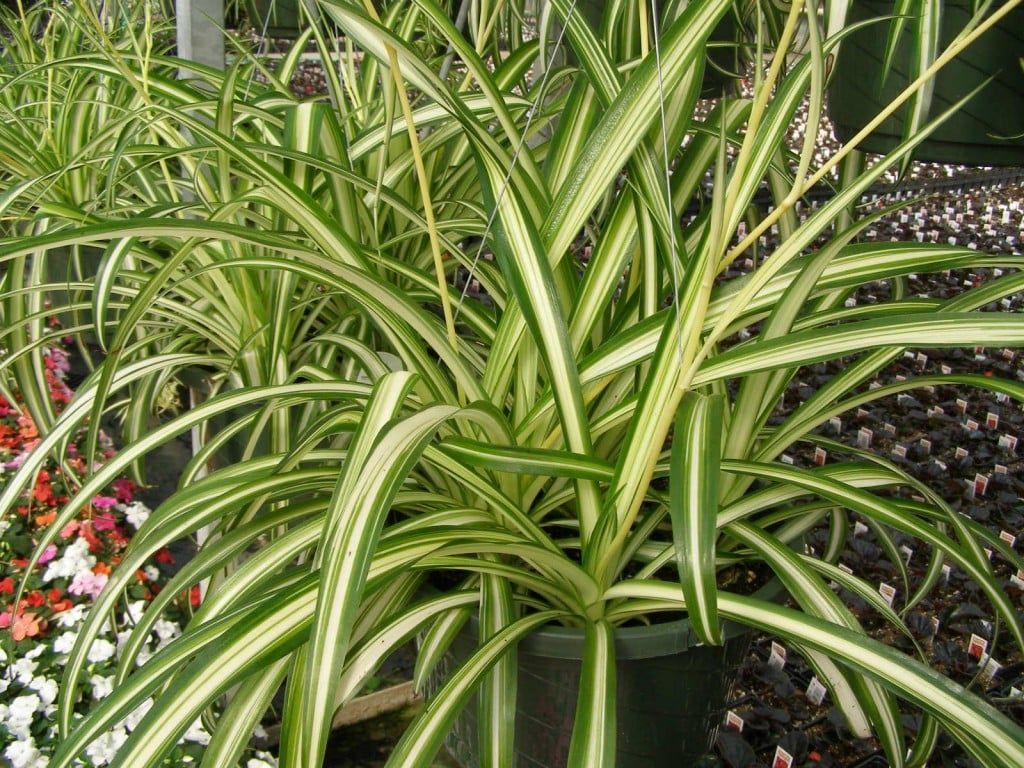Its long, arching green-and-white striped leaves and baby “spiderettes” make it attractive in hanging baskets or on shelves.