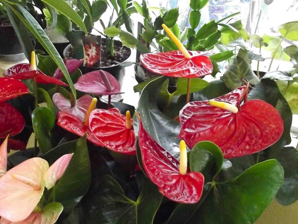 Anthuriums are prized for their glossy heart-shaped leaves and long-lasting, colorful spathes that resemble flowers.