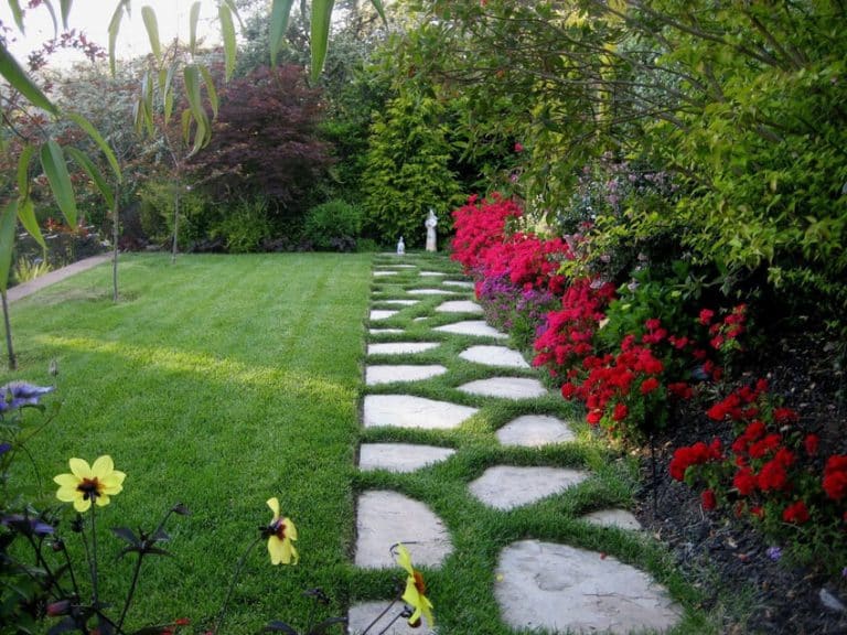 Precast concrete pavers and stepping stones come in various sizes, shapes, and colors. You can lay them in straight lines, staggered formations, or irregularly spaced to create visual rhythm. Spacing stones with grass or moss growing in between softens the hard edges.