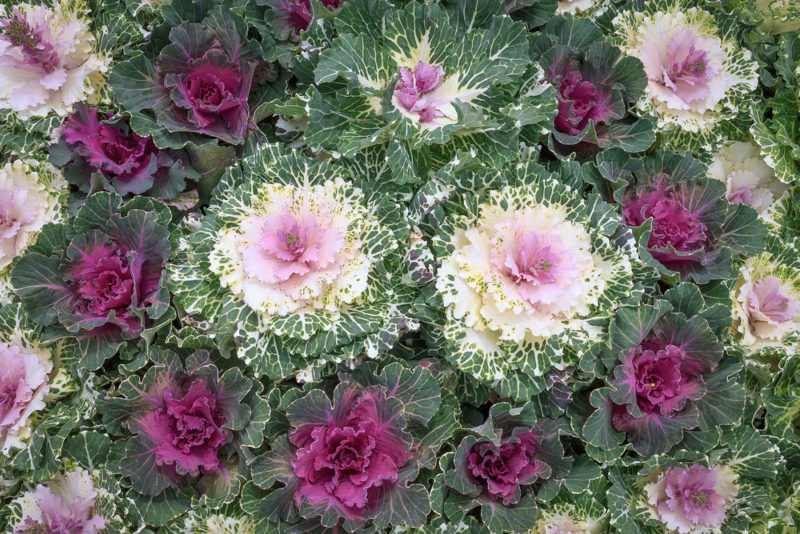 Flowering kale boasts rosettes of frilly, colorful leaves in white, pink, and purple. It tolerates frost and gets even more vibrant as temperatures drop.