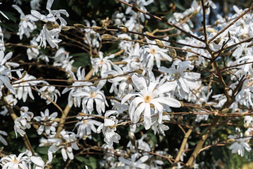 A compact magnolia variety, the Star Magnolia blooms with stunning white or pink flowers in early spring.