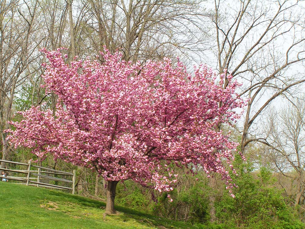 The Kwanzan Cherry tree is a showstopper with its double-pink blossoms in spring.