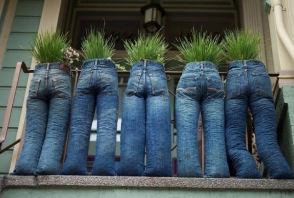 Stuff old jeans with soil and flowers for a quirky and fun planter. Position them to appear as if they are “sitting” in your garden for a playful effect.