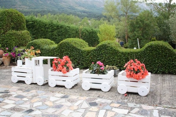 Build a mini wooden train using logs or scrap wood, then fill each “car” with plants and flowers for an adorable garden centerpiece.