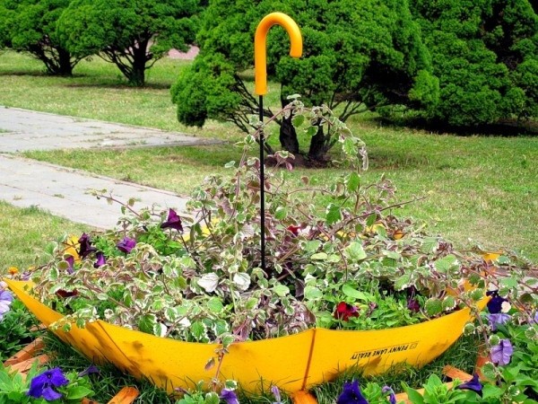 Repurpose an old or broken umbrella into a unique planter! Just fill it with soil and flowers, then secure it upright or upside-down for a quirky garden display.